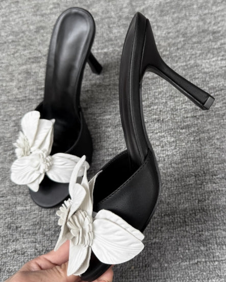 Schwarze Absatz Sandaletten mit weißer Blüte